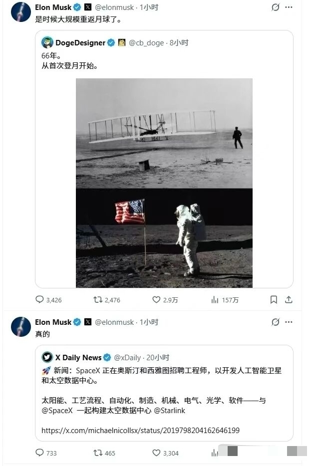$神剑股份(SZ002361)$ $巨力索具(SZ002342)$ $航天发展(SZ000547)$ 马斯克最新消息!是时候大规模重返月球了。