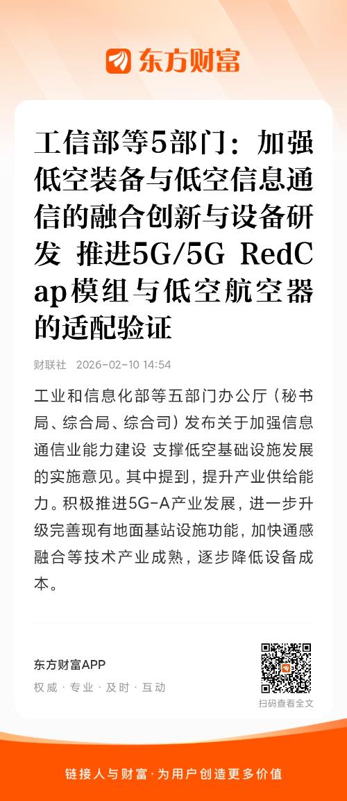 工业和信息化部等五部门办公厅(秘书局、综合局、综合司)发布关于加强信息通信业能力建设 支撑低空基础设施发展的实施意见。其中提到,提升产业供给能力。积极推进5G-A产业发展,进一步升级完善现有地面基站设施功能,加快通感融合等技术产业成熟,逐步降低设备成本。加强低空装备与低空信息通信的融合创新与设备研发,推进5G/5G RedCap模组与低空航空器的适配验证。探索低空通信、导航、监视功能融合模组研发,加速技术和产业成熟。