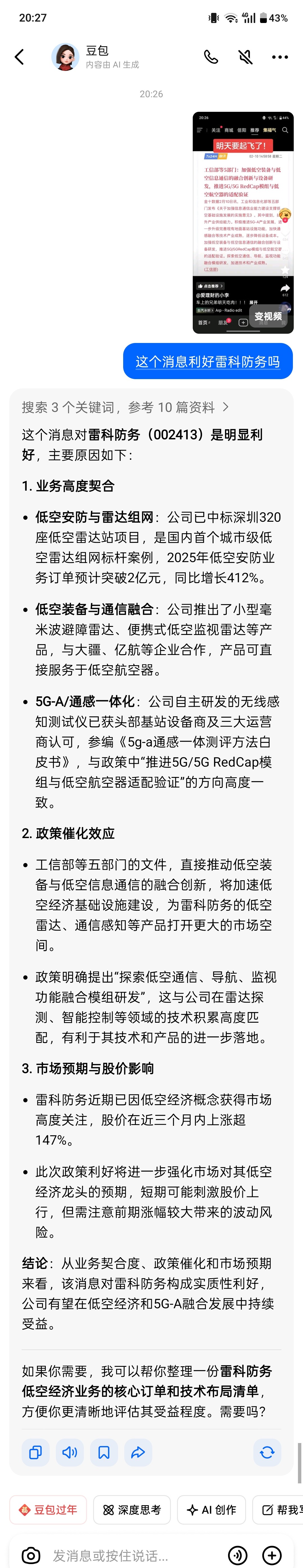 $雷科防务(SZ002413)$ 我秘书说利好雷科防务,明天能一字涨停吗?