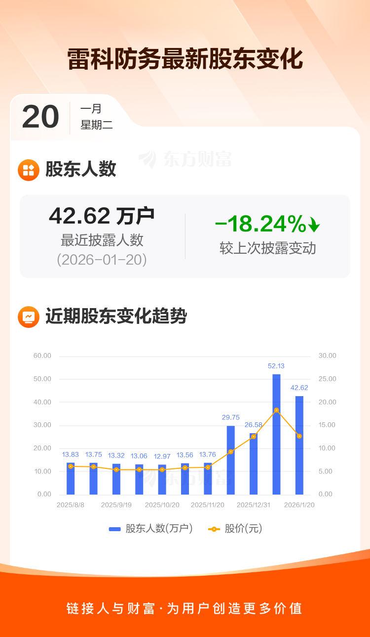 雷科防务:截至1月20日最新股东户数42.62万户,较上期减少18.24%