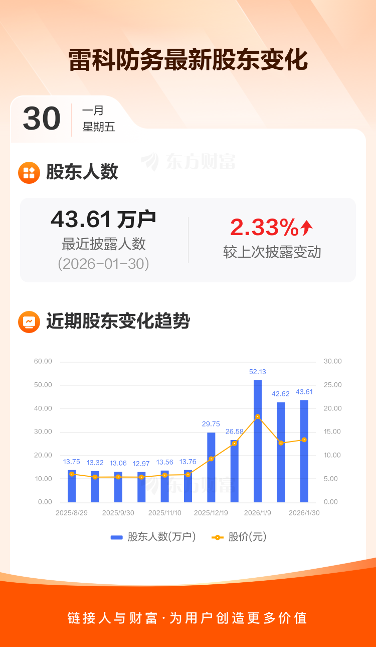 雷科防务:截至1月30日最新股东户数43.61万户,较上期增加2.33%