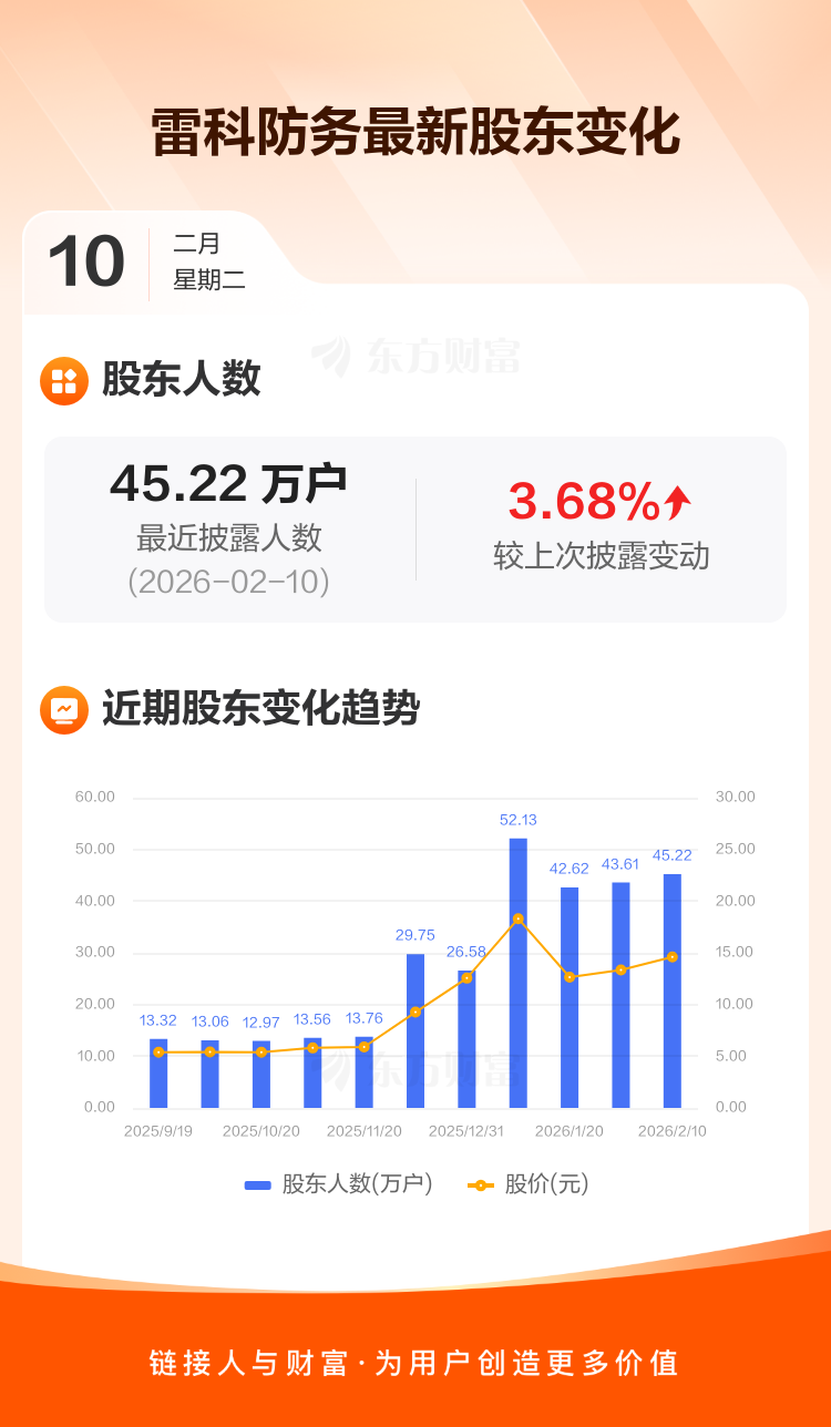雷科防务:截至2月10日最新股东户数45.22万户,较上期增加3.68%