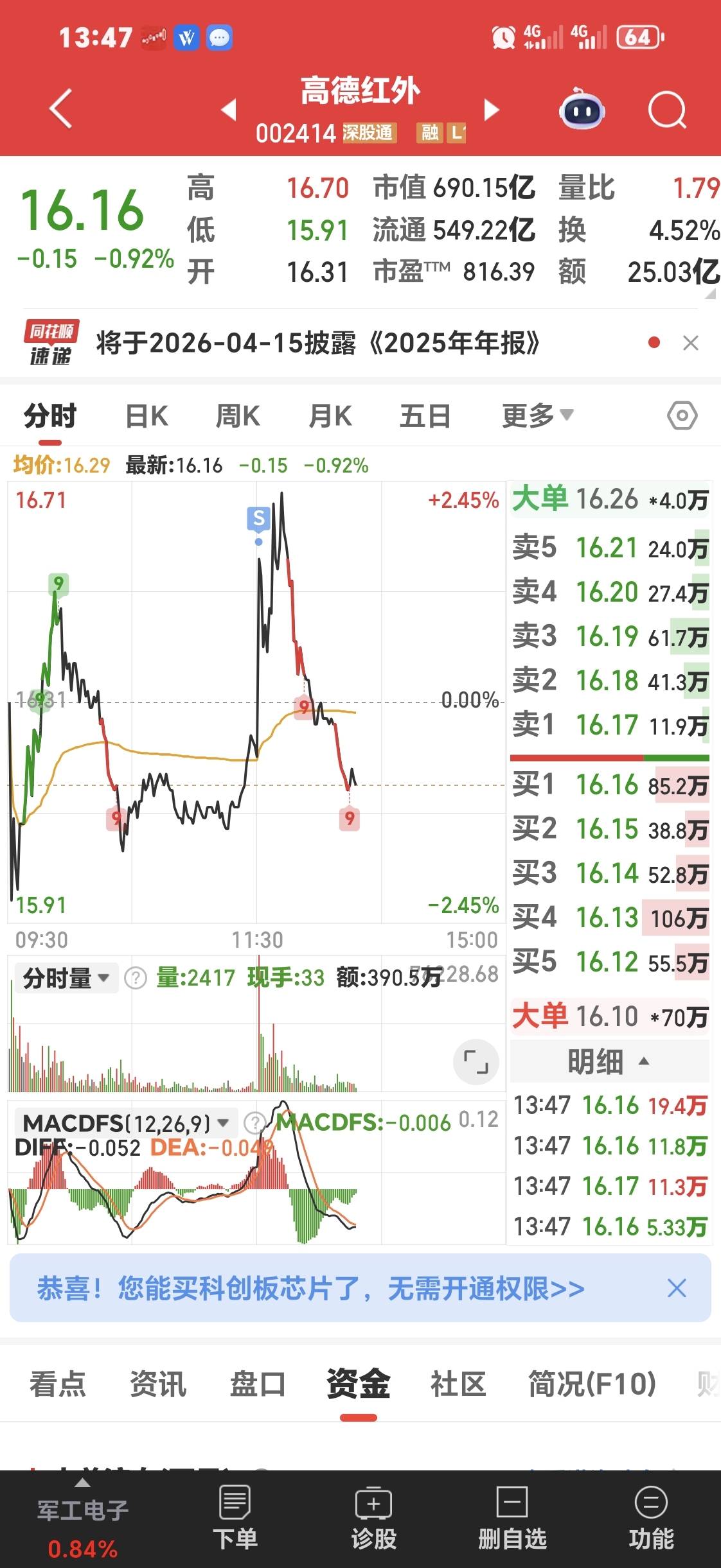$高德红外(SZ002414)$ 昨晚挂个以为不能成交的价格,一觉醒来筹码被主力抢走了