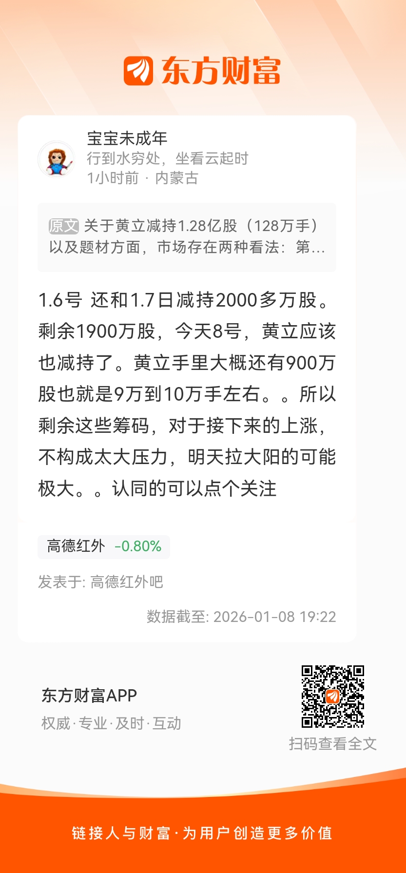 //@宝宝未成年 :1.6号还和1.7日减持2000多万股。剩余1900万股,今天8号,黄立应该也减持了。黄立手里大概还有900万股也就是9万到10万手左右。。所以剩余这些筹码,对于接下来的上涨,不构成太大压力,明天拉大阳的可能极大。。认同的可以点个关注