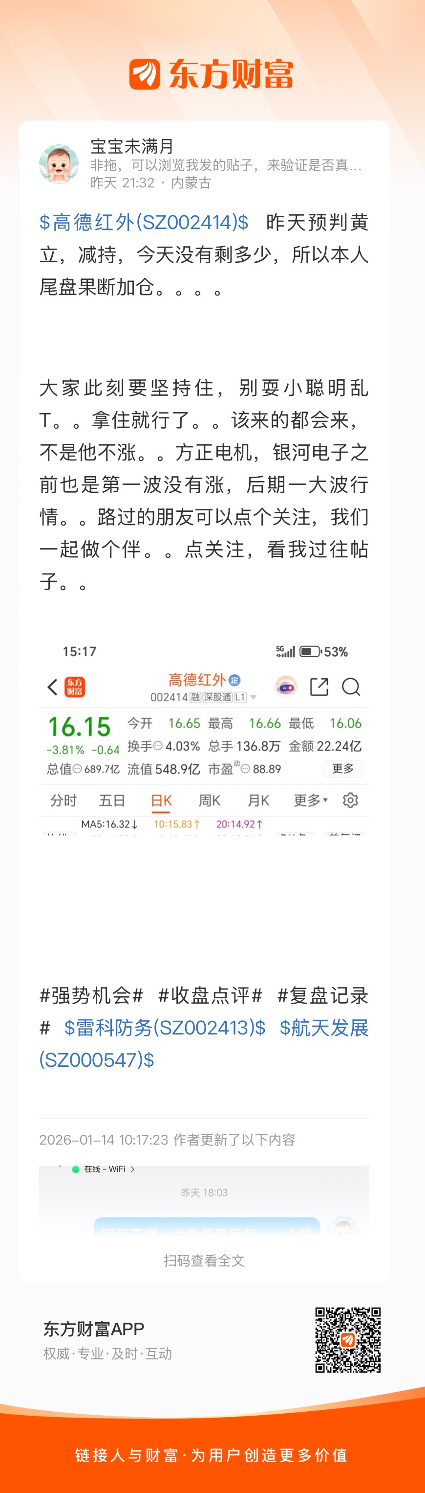 温馨提示: 1.根据《证券法》规定,禁止编造、传播虚假信息或者误导性信息,扰乱证券市场;2.用户在本社区发表的所有资料、言论等仅代表个人观点,与本网站立场无关,不对您构成任何投资建议。用户应基于自己的独立判断,自行决定证券投资并承担相应风险。《东方财富社区管理规定》