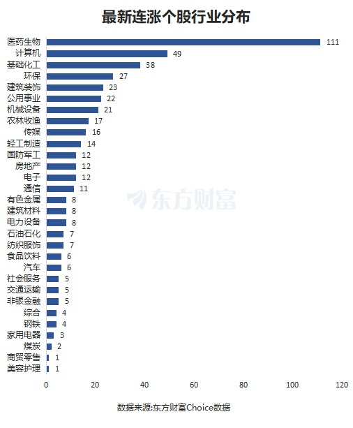 从行业分布来看,最新连涨5天以上的465股,分布于医药生物最多,为111股。计算机紧随其后,为49股。基础化工为38股。环保、建筑装饰、公用事业也分布靠前。