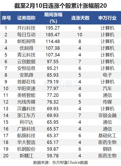 从股价涨幅来看,6连涨的并行科技,累计上涨195.27%。每日互动紧随其后,10天累计上涨185.47%。新炬网络8连涨,累计涨幅114.48%。优刻得、青云科技、云创数据等连涨股也涨幅靠前。