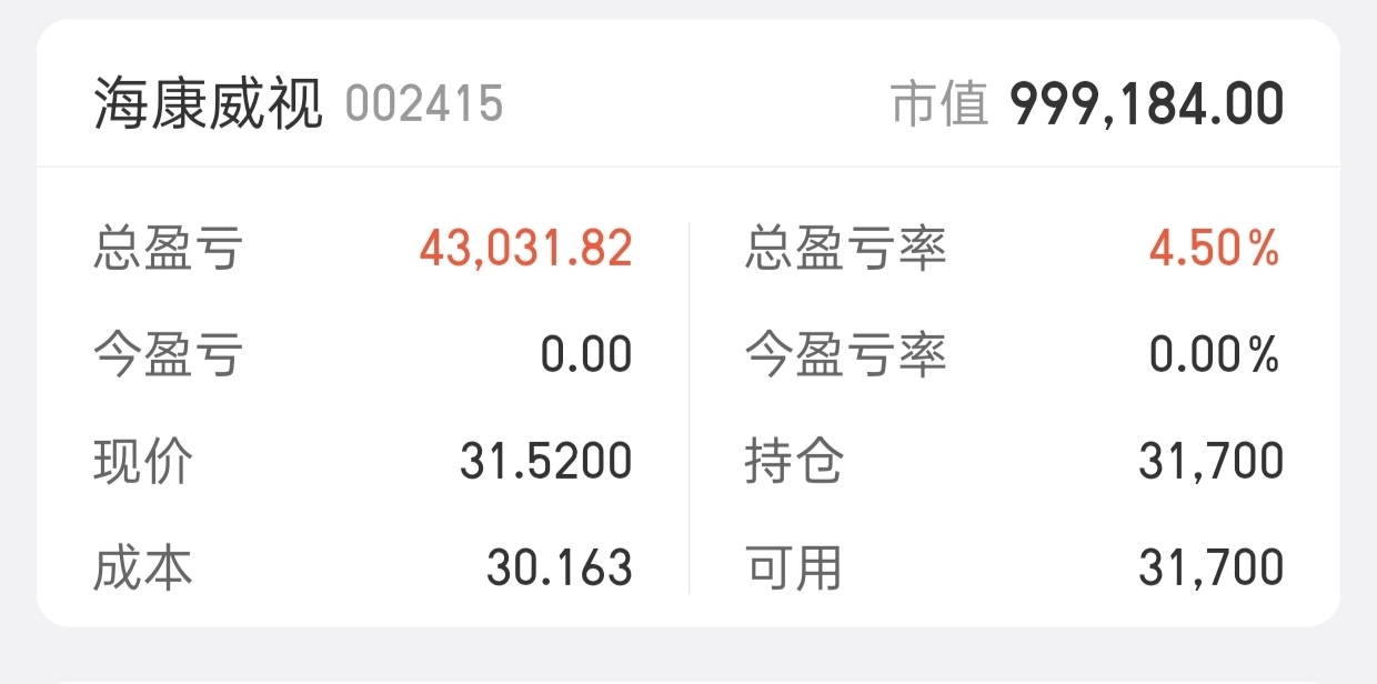 $海康威视(SZ002415)$ 用实际行动支持海康威视,锁仓半年。海康在牛市中会迟到,但不会缺席