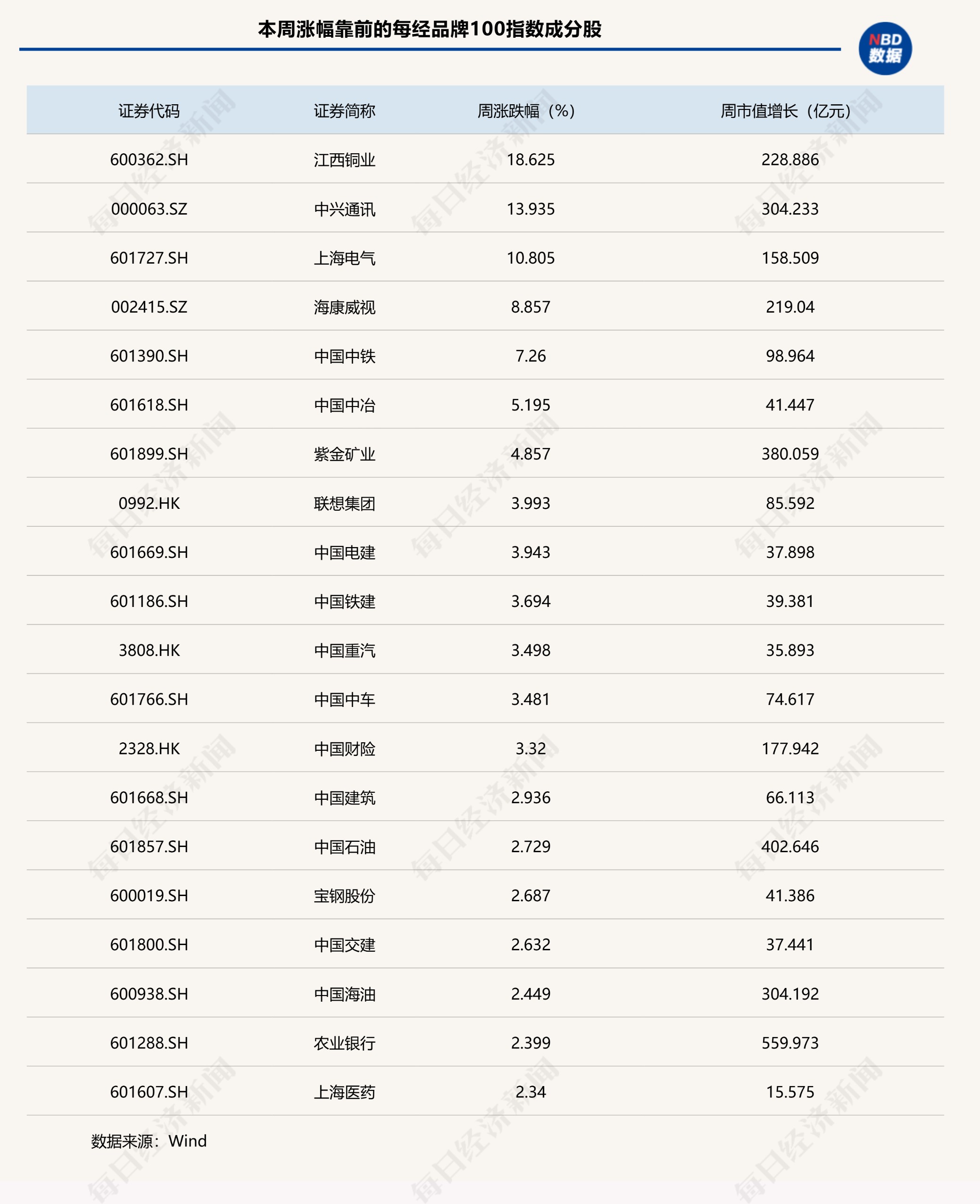 从本周每经品牌100指数成分股具体表现来看,江西铜业、中兴通讯以及上海电气周涨幅均超过10%,而海康威视周涨幅接近9%,整体涨幅较大。值得关注的是,作为全球安防产业龙头,海康威视在场景数字化的进展受到业内广泛关注。