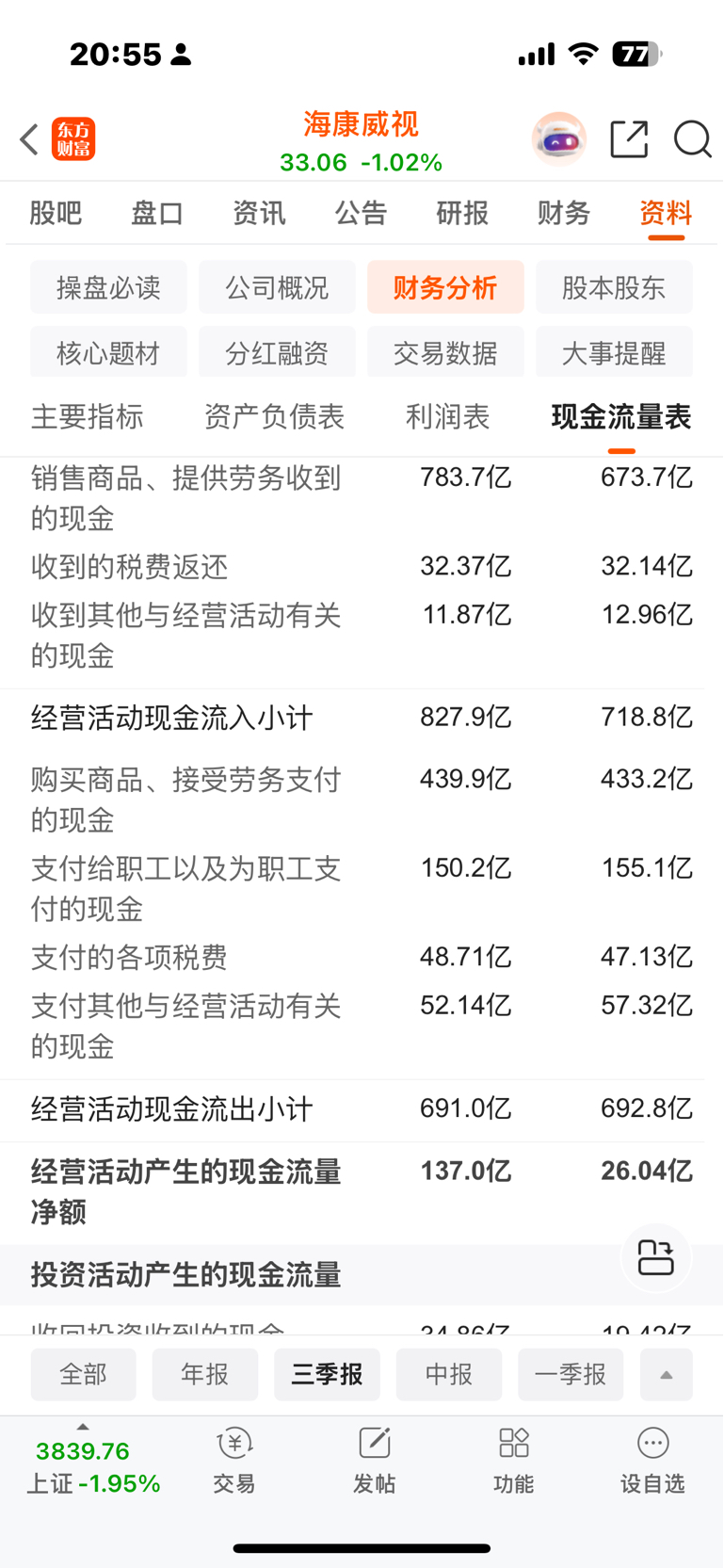 $海康威视(SZ002415)$ 经营活动产生的现金净额急剧增长,看来企业即将进入顺周期时刻。