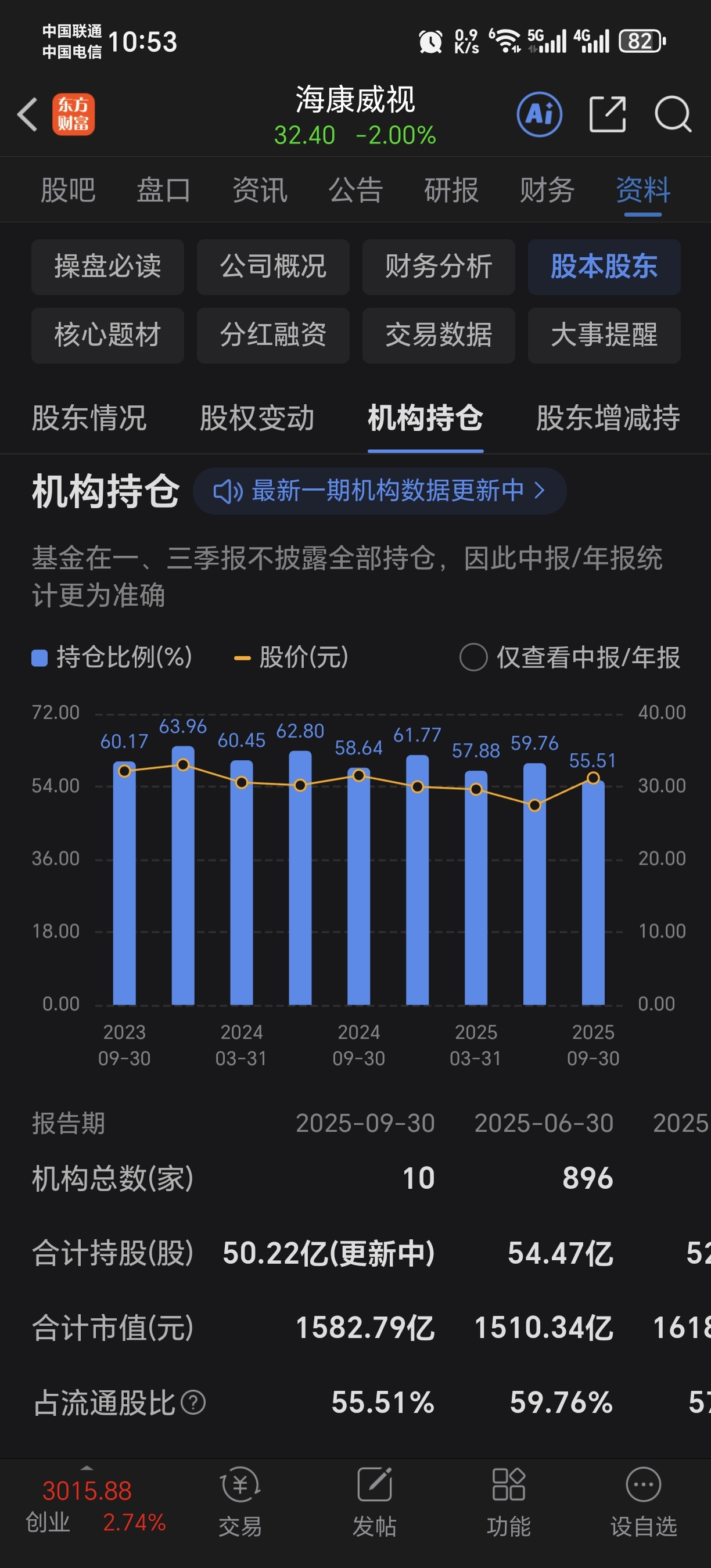 $海康威视(SZ002415)$ 机构持仓由二季度894家减少到三季度的10家,占比55.51%可以说筹码很集中,持仓的机构多了容易产生分歧,少了资金实力不够,所以这是最现实的问题,3000亿的流通盘,不来点机构资金合力推是完全不行的,必须往下砸让资金上船,未来才有上涨动能!