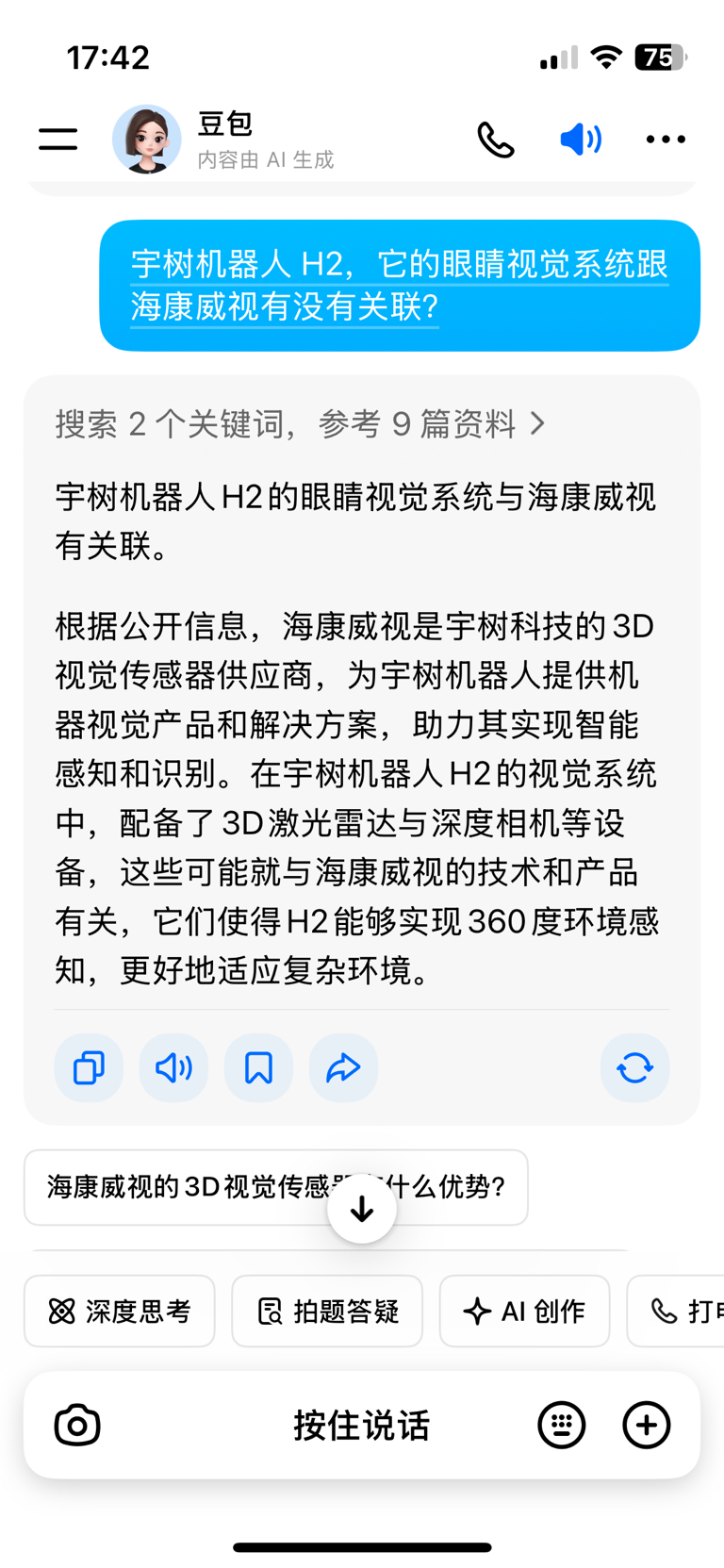 $海康威视(SZ002415)$ 豆包说了,宇树机器人H2的最新产品使用了海康威视的产品,海康要起飞了