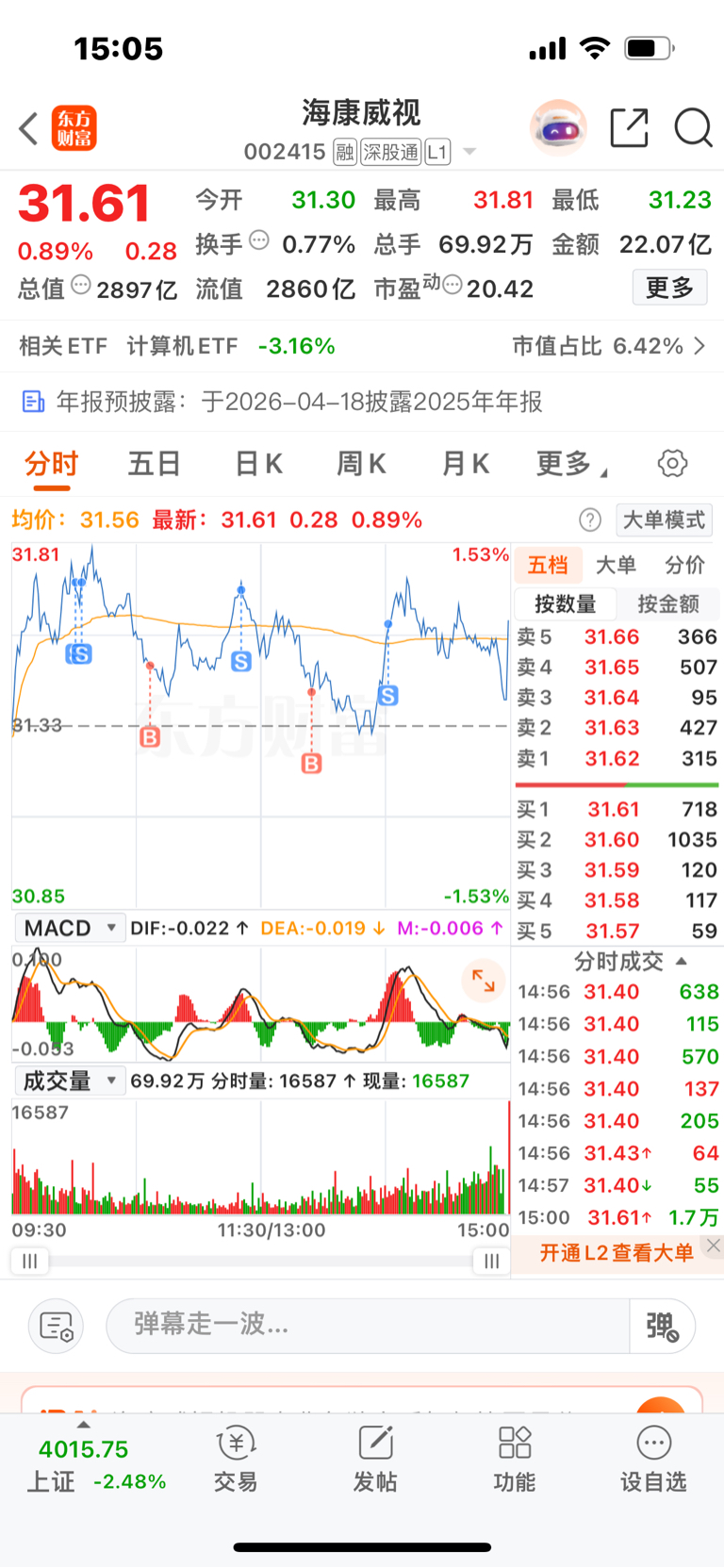 $海康威视(SZ002415)$ 抓腾了一天的T,刚56分下到31.4想挂单再买的没时间了