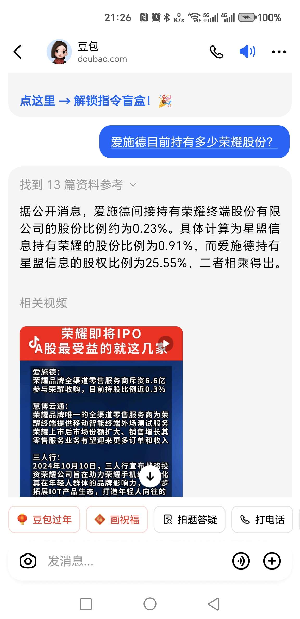 $爱施德(SZ002416)$ 据公开消息,爱施德间接持有荣耀终端股份有限公司的股份比例约为0.23%。具体计算为星盟信息持有荣耀的股份比例为0.91%,而爱施德持有星盟信息的股权比例为25.55%,二者相乘得出。