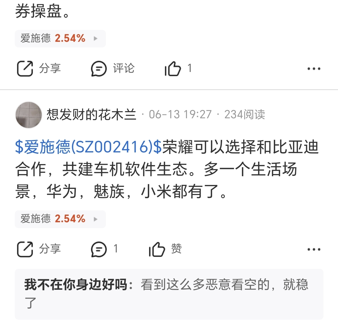 $爱施德(SZ002416)$ 看看我几个月前就发的,比亚迪就差手机这个移动闭环了,和华为是不可能了,华为已经和各种界合作了。魅族和吉利合作了,荣耀就是最佳合作对象。现在爱施德有大数据,有算力中心,有企业,有销售渠道,有消费场景,千亿市值。