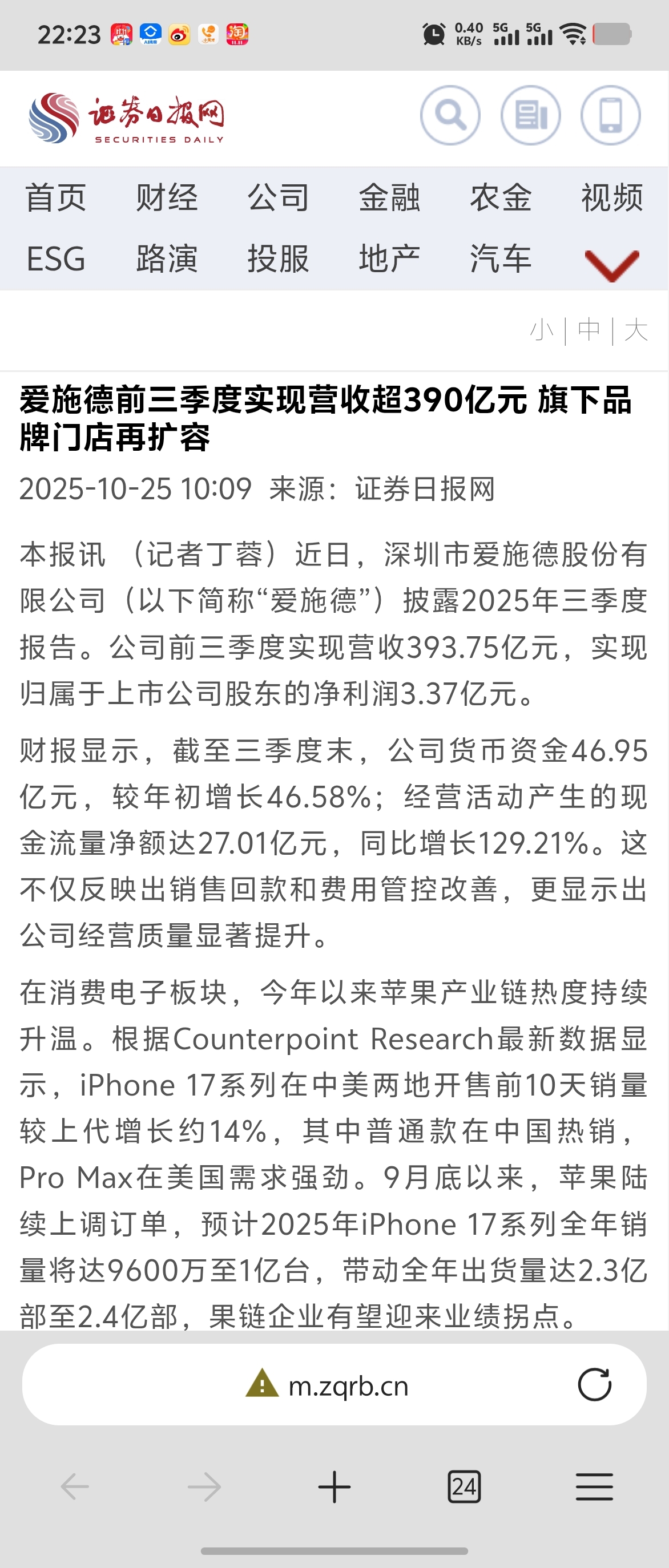$爱施德(SZ002416)$ 真正做实事的好企业,证券日报首页报道,肯定了爱施德的实力,荣耀上市,爱施德智算,投资云深处和赛感,优木新能源,悦小开,茶小开的强力发展,苹果亚太最大经销商,荣耀唯一省代,海外的稳定发展,稳定的业绩,强大的现金流,很多攒3个亿市值都500亿,目前股价完全是低估
