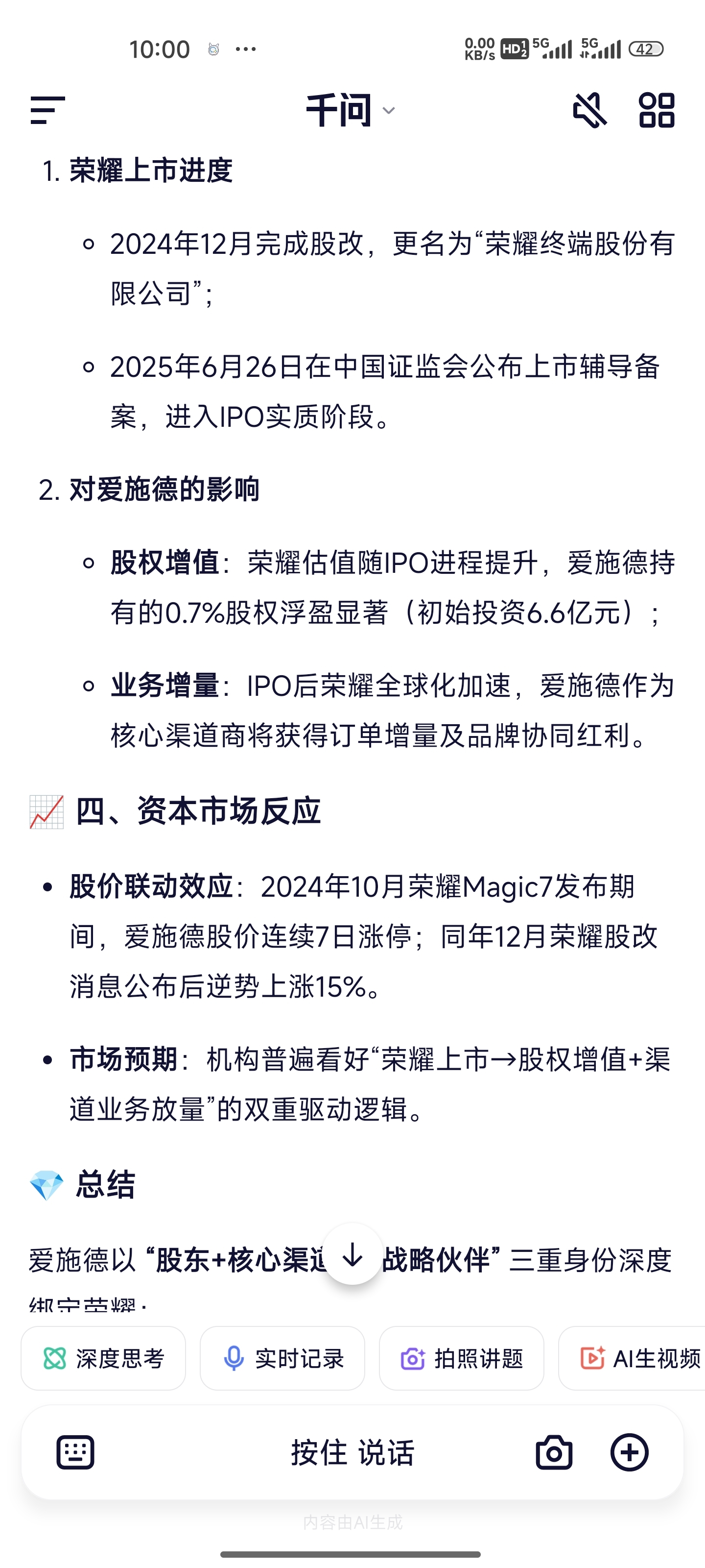 持有荣耀IPO0.7%,按照荣耀上市估值3000亿,就是21亿,荣耀已经转型AI