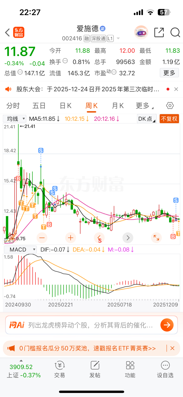 $爱施德(SZ002416)$ 守了一年等荣耀没等到,加仓再守一年试试看,成本12.6。