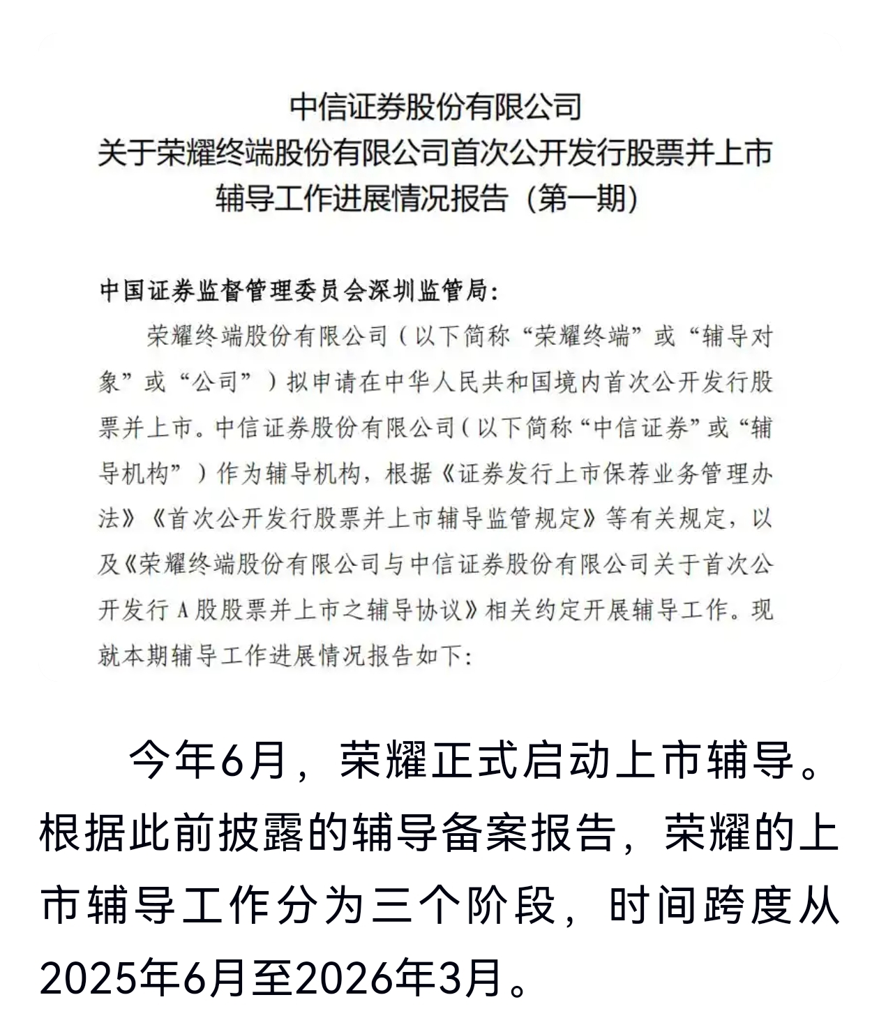 荣耀还有3个月完成ipo辅导