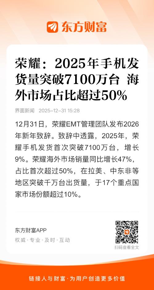12月31日,荣耀EMT管理团队发布2026年新年致辞。致辞中透露,2025年,荣耀手机发货首次突破7100万台,增长9%。荣耀海外市场销量同比增长47%,占比首次超过50%,在拉美、中东非等地区突破千万台出货量,于17个重点国家市场份额超过10%。