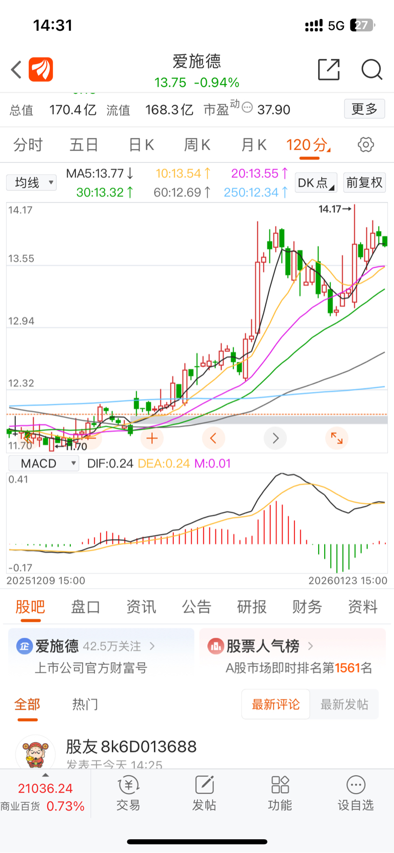 $爱施德(SZ002416)$ 120分钟顶背离,拣点仓庚剩饭涨涨,还学会顶背离了。看看有色科技,稳稳地幸福