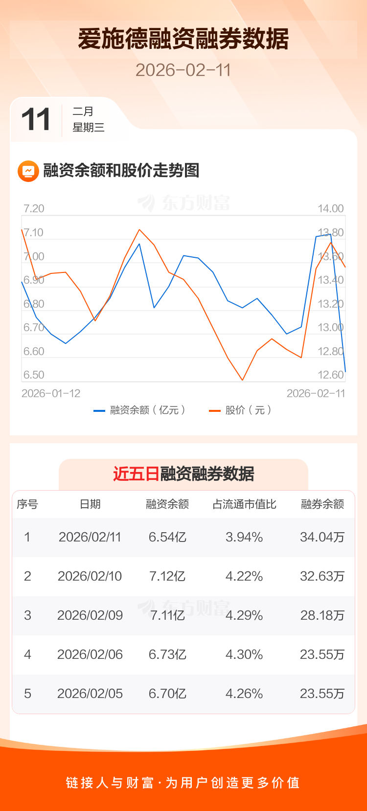 交易所最新数据显示,爱施德于2026年2月11日获融资买入2481.45万元,融资偿还8269.90万元,当日融资净偿还5788.45万元。目前,该股融资余额6.54亿,占流通市值比例为3.94%。