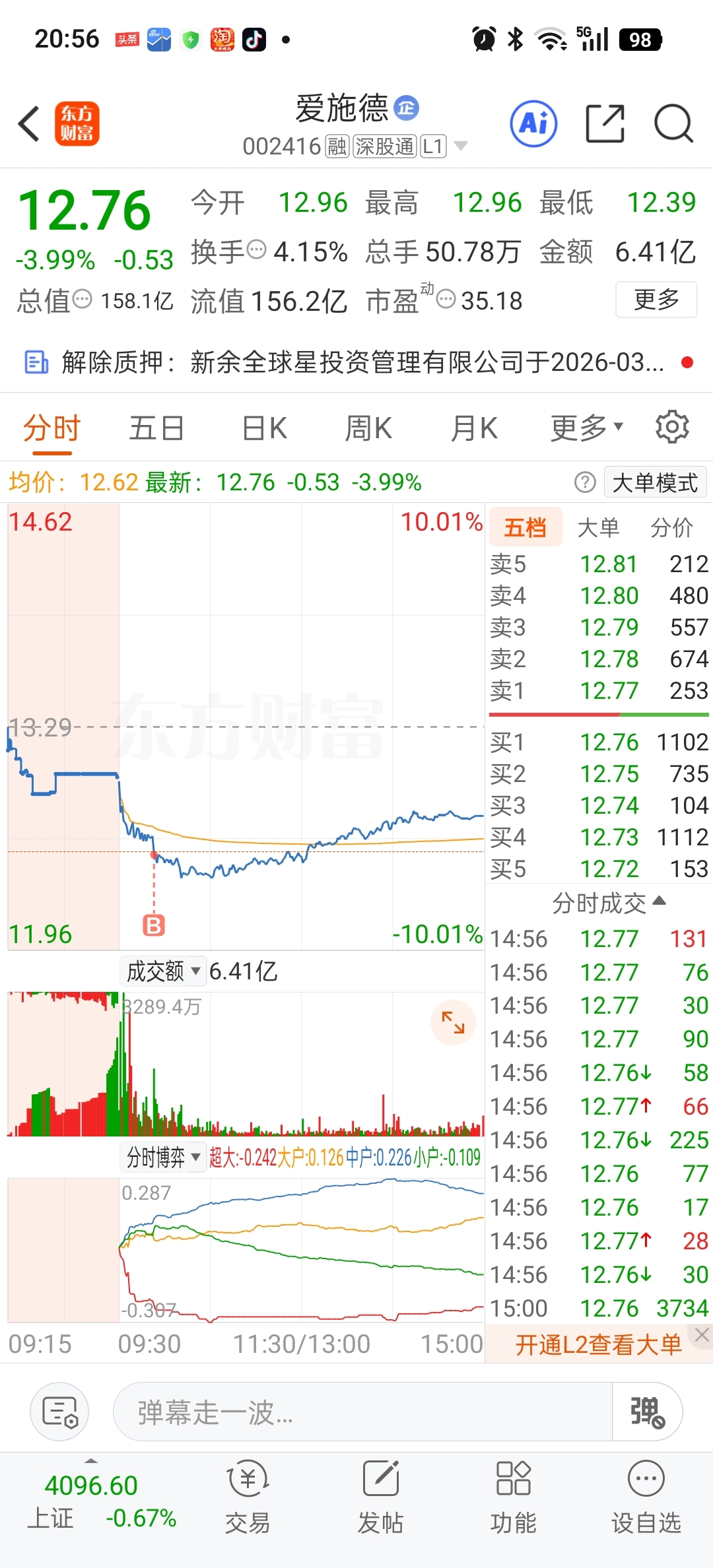 $爱施德(SZ002416)$ 幸好没性情,买了0.5成仓,看评论区我是抄底抄早了,跌一个星期最好,每天0.5成,我能加20天