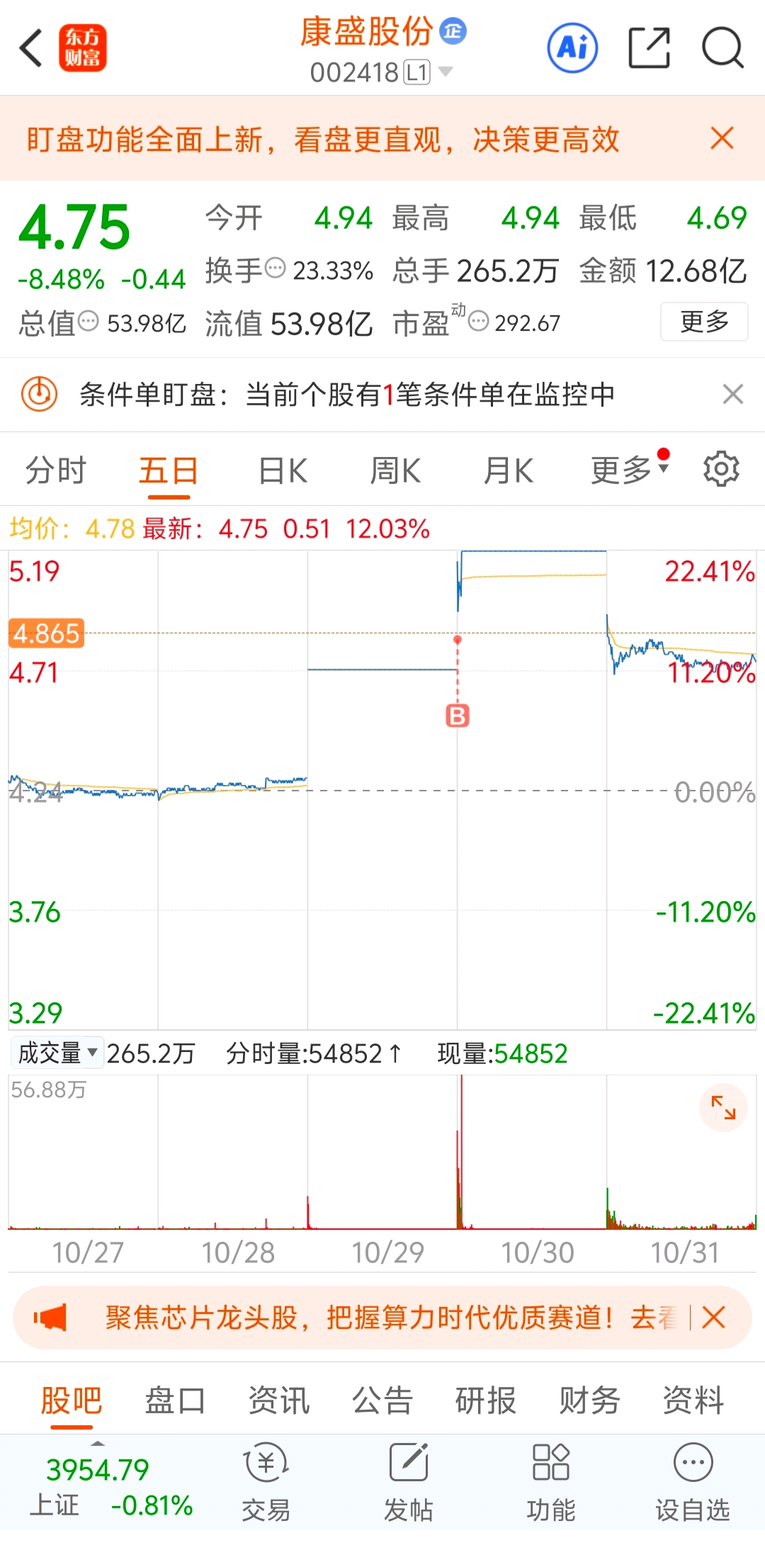 $康盛股份(SZ002418)$ 早上竞价情况并不乐观,应该开盘就跑掉的,还能少赚点跑路,设条件单设成了高于昨日涨停价回落卖出……还是高估了#炒股日记# #实盘记录# 只能蹲下周一的机会了