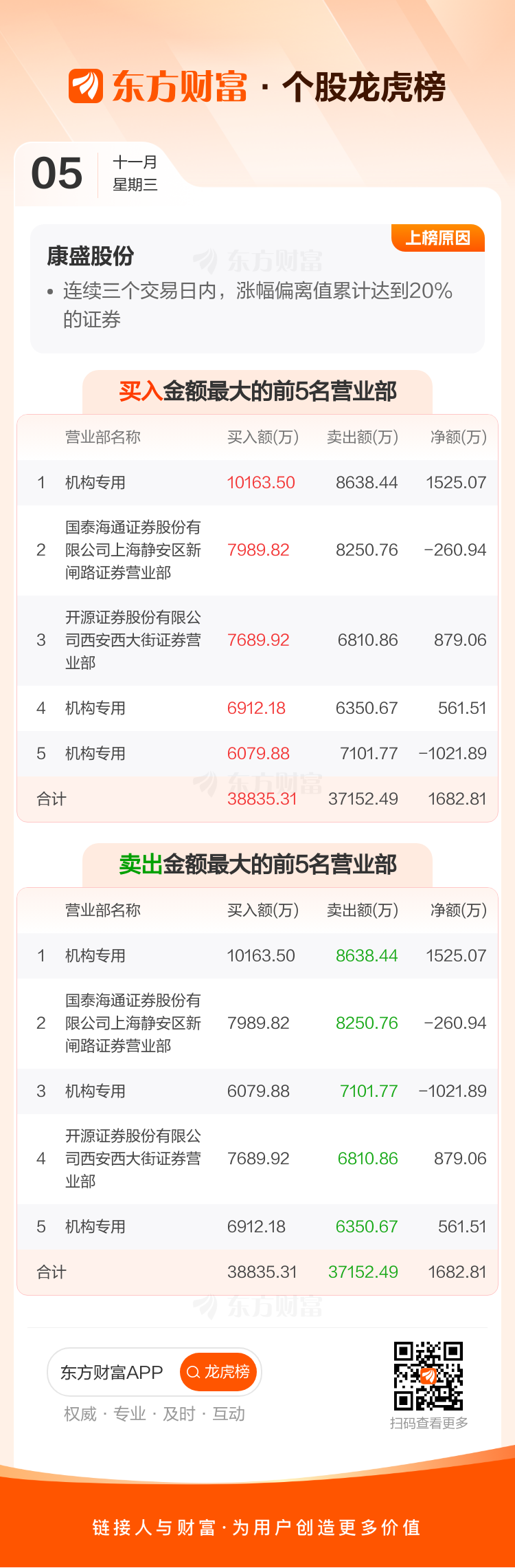 交易所2025年11月5日公布的交易公开信息显示,康盛股份因成为连续三个交易日内,涨幅偏离值累计达到20%的证券上榜。康盛股份当日收报5.71元,涨跌幅6.93%,换手率30.47%,成交额19.40亿。异常期间11月3日至11月5日,期间涨幅20.21%,累计偏离值20.68%,区间成交额47.54亿。