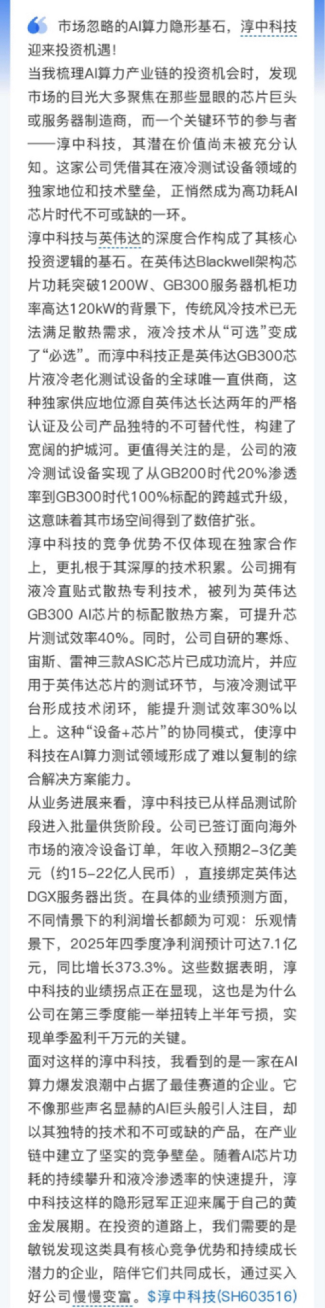 康盛股份三季报和淳中科技三季报同时扭亏为盈,预计第四季度会同步淳中科技大幅扩大盈利水平,2026年业绩会逐级爆发,千岛湖智造基地项目2026年6月竣工投产,与英伟达 Rubin GPU 计划于 2026年第三或第四季度进入量产神同步,未来走势参照易中天。