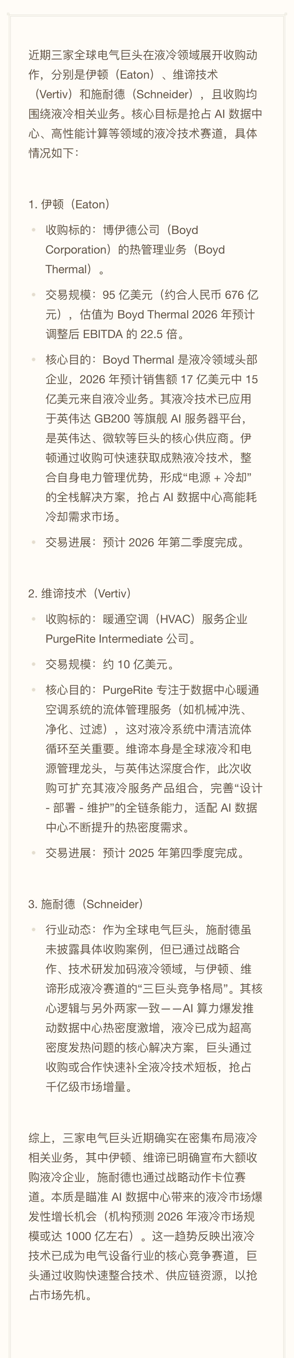没有液冷的数据中心会逐步被淘汰,新的数据中心全部标配液冷,原有数据中心逐步升级为液冷,一块芯片一套液冷,加上存量升级改造液冷,市场需求巨大,一片蓝海,全球电器巨头近期都在大力收购液冷技术