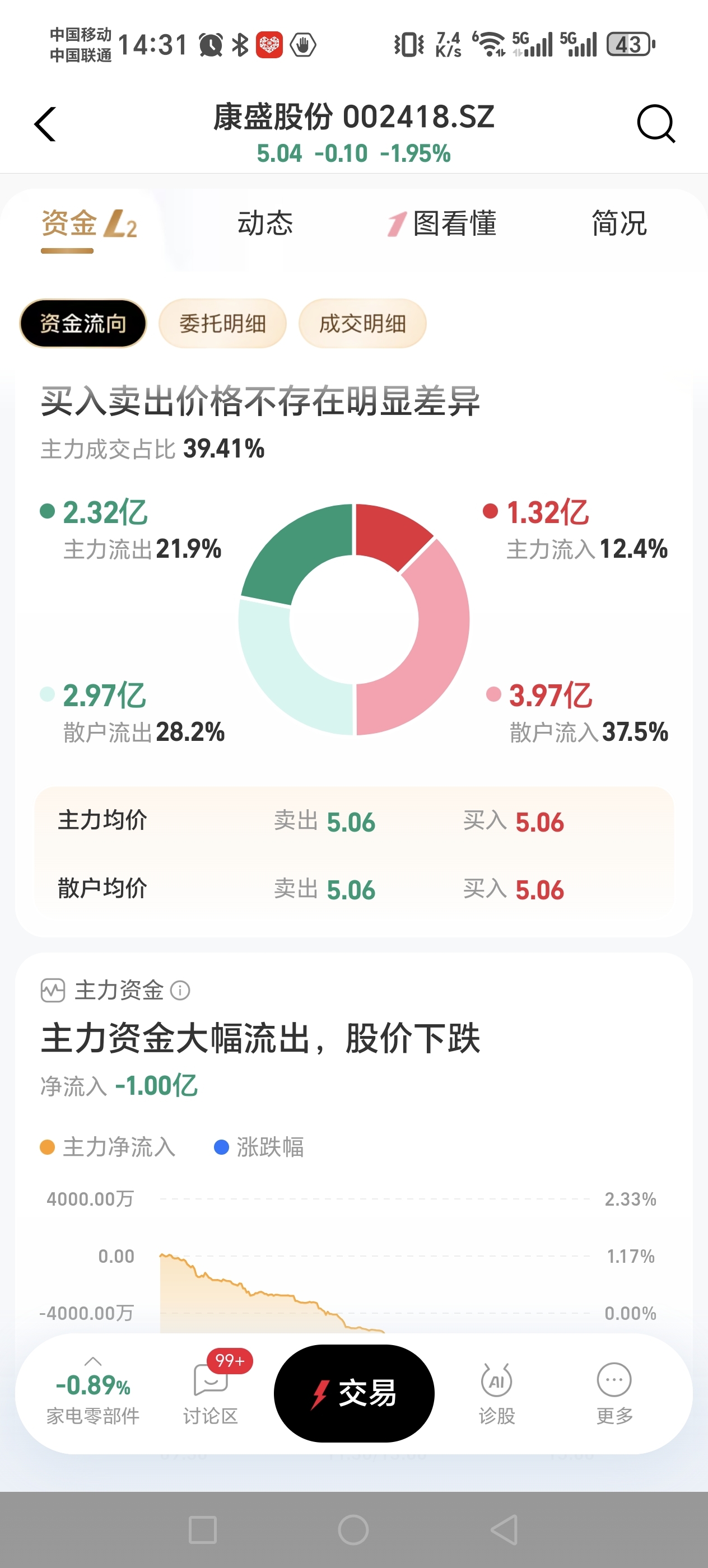 $康盛股份(SZ002418)$ 跑了一个亿了!真牛主力!
