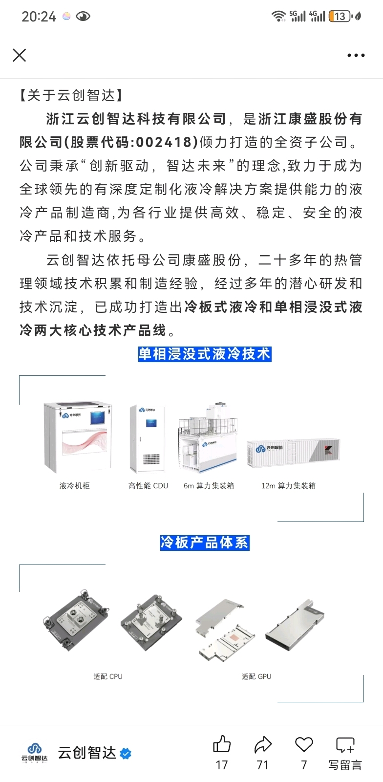 康盛股份是实打实的液冷概念云创智达的液冷解决方案,覆盖冷板式液冷解决方案、浸没式
