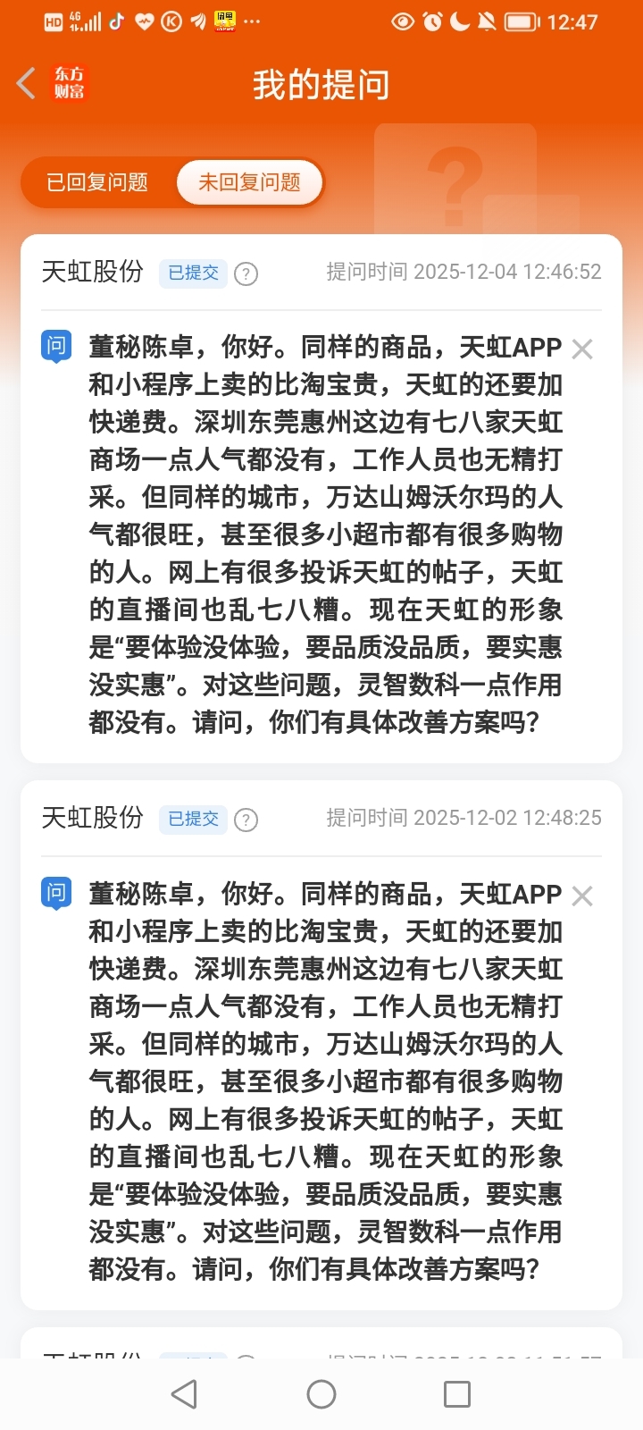 $天虹股份(SZ002419)$ 麻烦大家帮我一起问,他们不把我的问题放在眼里
