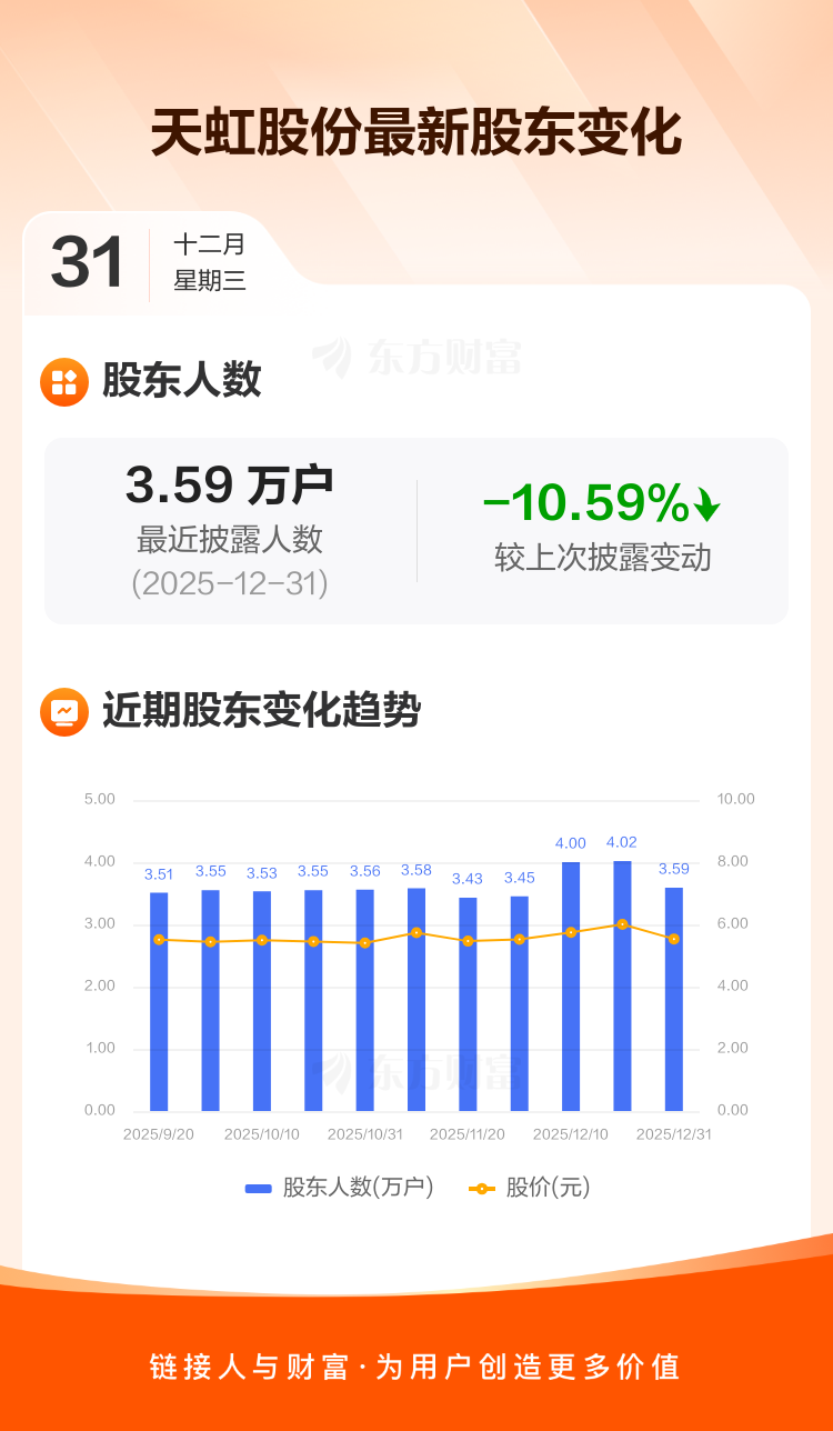 天虹股份最新披露数据显示,截至12月31日公司股东户数为3.59万户,较上期(2025年12月19日)减少4254户,降幅为10.59%。户均持有流通股数量由上期的2.91万股上升至3.25万股,户均持股金额由上期的17.45万元增加至17.99万元。