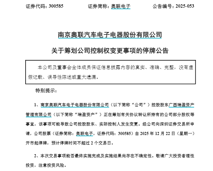 奥联电子公告称,公司于2025年12月19日收到控股股东广西瑞盈资产管理有限公司的通知,获悉瑞盈资产正在筹划有关协议转让所持有的公司部分股权等事宜,该事项可能导致公司控股股东、实际控制人发生变更。目前,各方主体正在就具体交易方案、协议等相关事项进行论证和磋商,具体情况以各方签订的相关协议为准。该事项尚处于筹划中,存在重大不确定性。