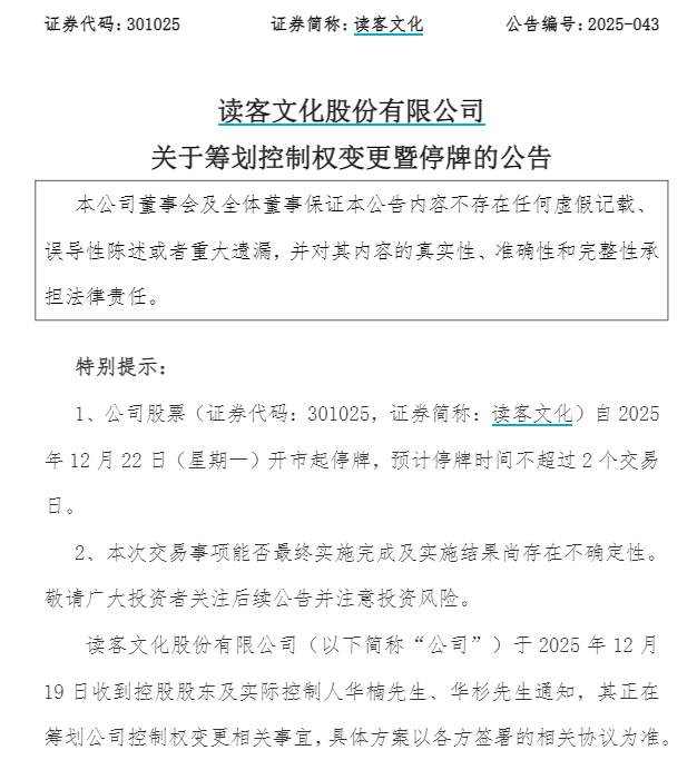 读客文化公告称,公司于2025年12月19日收到控股股东及实际控制人华楠先生、华杉先生通知,其正在筹划公司控制权变更相关事宜,具体方案以各方签署的相关协议为准。上述事项的具体方案尚在筹划中,尚未签署正式协议,具有不确定性。