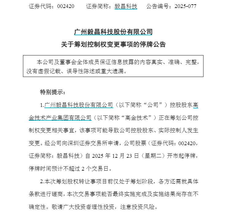 12月22日晚间,毅昌科技(002420)发布《关于筹划控制权变更事项的停牌公告》。公告显示,公司于2025年12月22日收到公司控股股东高金技术的通知,公司控股股东高金技术产业集团有限公司正在筹划公司控制权变更相关事宜,该事项可能导致公司控股股东、实际控制人发生变更。目前各方尚未签署相关协议,正在就具体交易方案、协议等相关事项进行论证和磋商,具体情况以各方签订的相关协议为准。该事项正在洽谈过程中,目前尚存在重大不确定性。