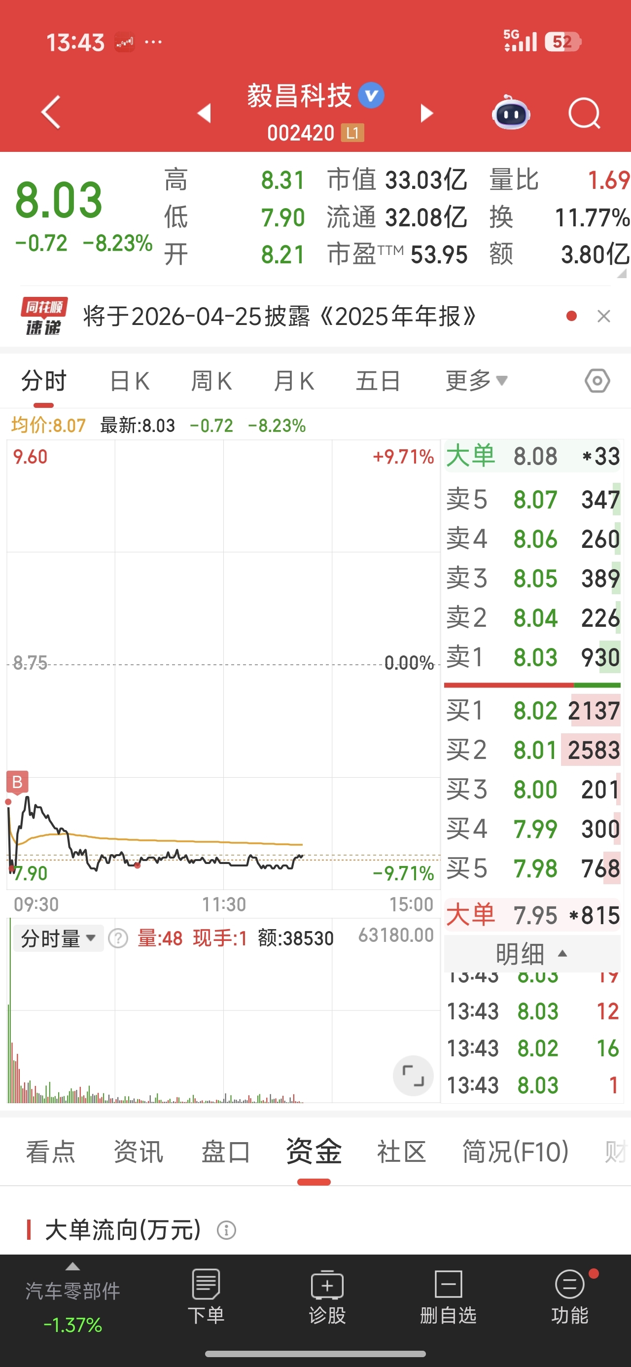 $毅昌科技(SZ002420)$ 开盘建了点底仓,后面在8.00左右建立更多仓位,原本在跌停7.88设置了大仓位,后面尾盘看着一直压就撤单了,既然主力要压,那我明天低开再大仓位进驻,玩超跌股我这心得还是可以的
