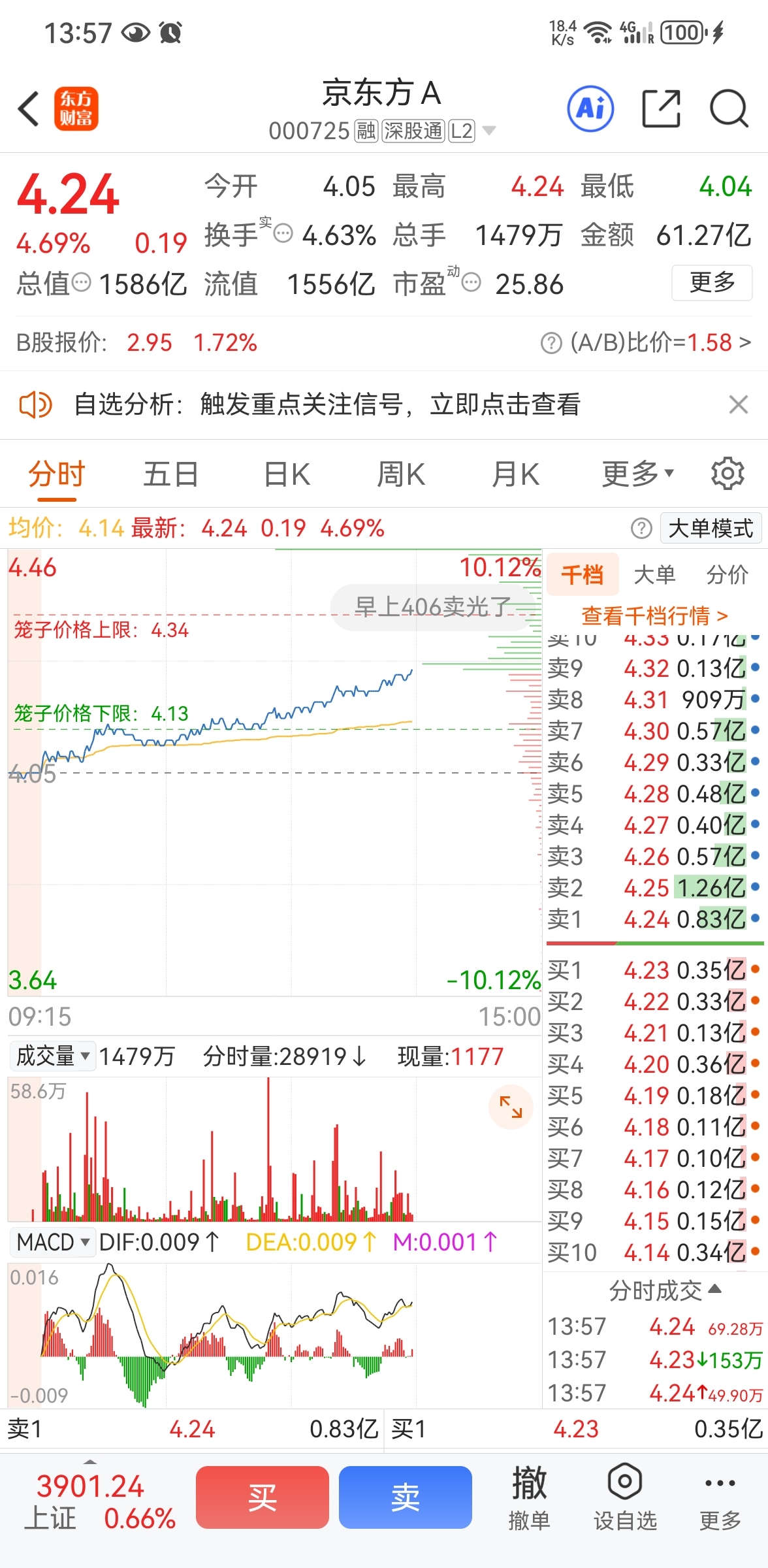 昨天卖了达华智能买的达实智能,也从3.82开始关注京东方A,觉得盘子太大还是选择
