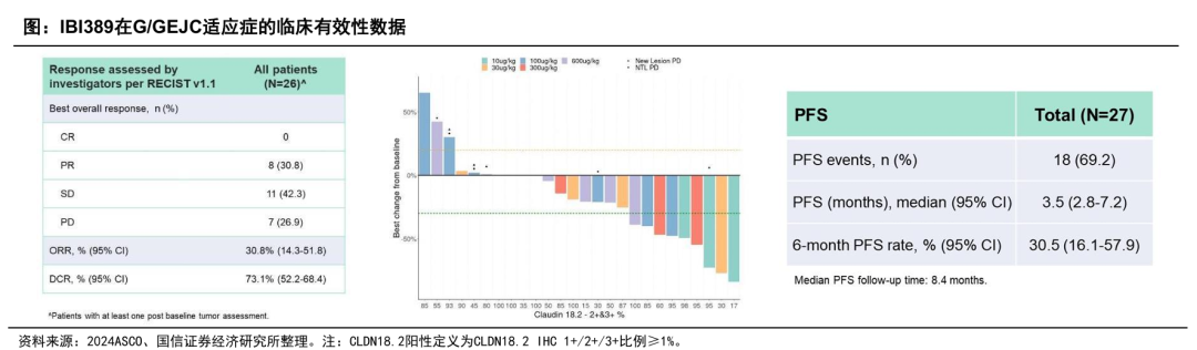 根据信达生物今年7月最新披露的1期研究结果,IBI343在治疗CLDN18.2阳性(≥75%肿瘤细胞,IHC≥2+)晚期GC/GEJC患者的6mg/kg剂量组中,ORR为32.3%,DCR为90.3%,mPFS为5.5个月,OS尚未成熟,目前为10.8个月;在8mg/kg剂量组中,ORR为47.1%, DCR为88.2%,mPFS为6.8个月,mOS未达到[4]。安全性方面,≥3级TRAEs发生率为52.6%[5]。