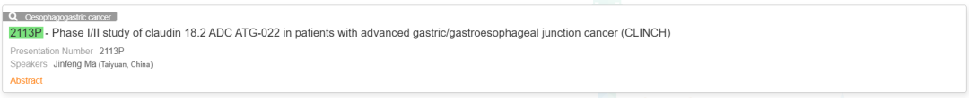 此外,此次ESMO大会上,另一款备受关注的在研CLDN18.2 ADC药物ATG-022也发布了最新数据,其治疗晚期GC/GEJC的1/2期研究结果显示:在剂量扩展阶段的30例可评估疗效患者中(IHC染色2+ >20%,接受ATG-022 2.4 mg/kg剂量治疗),观察到1例完全缓解、11例部分缓解和15例疾病稳定,ORR为40%,mPFS为5.1个月。安全性方面,所有患者≥3级TRAE发生率为46.0%,整体安全性可控。