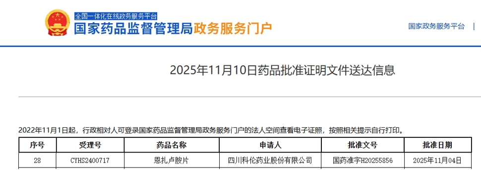 11月10日,国家药监局(NMPA)官网显示,科伦药业的恩扎卢胺片仿制药获批上市