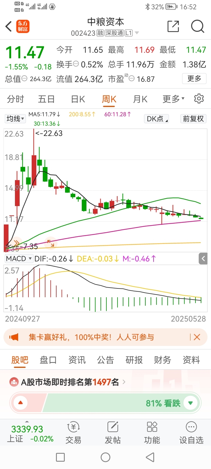$中粮资本(SZ002423)$ 如果收盘在11.41以下就形成日线级别的二次底背离,也是结构位的限低点,到这里就是阶段性的底部不会再怎么向下了,周线60周均线在11.28元,下周上升到11.35元左右也具有强烈支撑。物极必反,最后的洗盘之后必定会向上爆发。