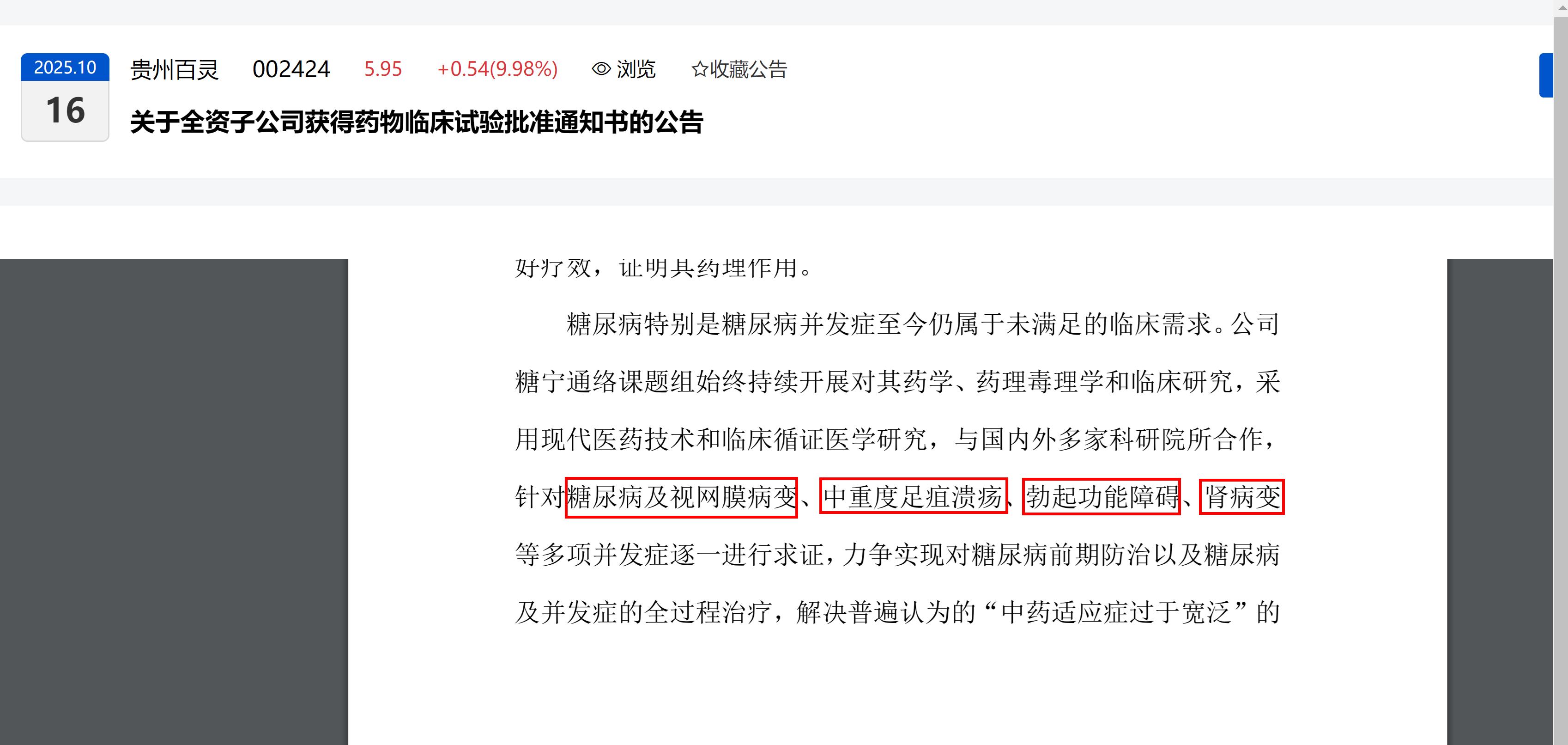 仔细研读公司公告,发现贵州百灵在中药创新路子走的目标(也可以说是‘野心’)好大,哪怕实现其中之一病症的治疗疗效,都是不得了。糖尿病、视网膜、肾病,哪个病都对人危害不浅。糖宁通络片如若都能对上述病症治好,其牵涉范围之广、涉及病人至多,那威力岂是贵州茅台品牌光只饮酒一项所能攀比?但估计临床试验期也短不了,路漫漫其修远兮,吾将上下而求索。我们就拭目以待吧。