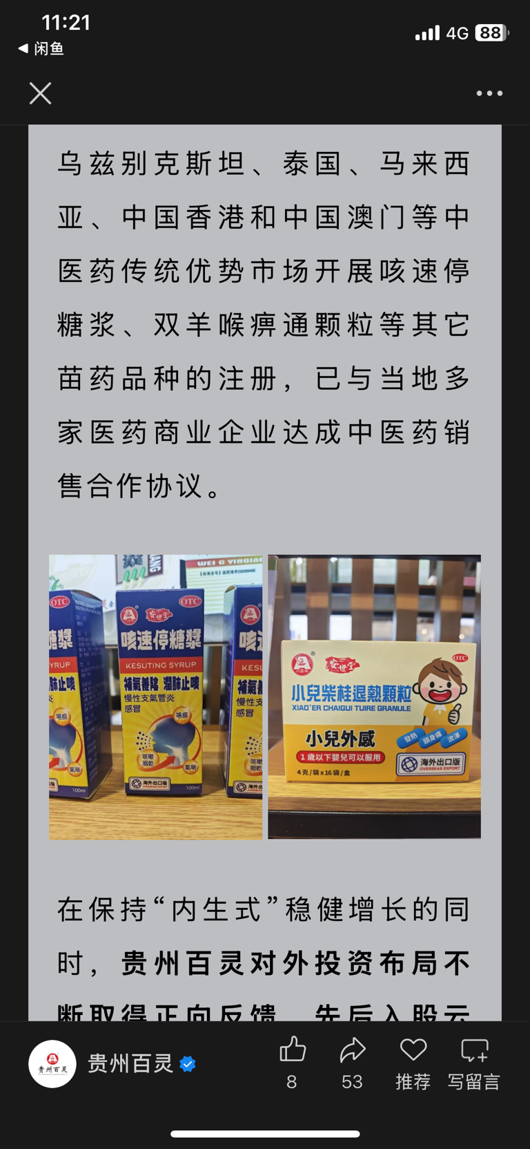 $贵州百灵(SZ002424)$ 已经有落地了,药效来开路,提升品牌知名度,其他关键的的药出海就顺理成章了