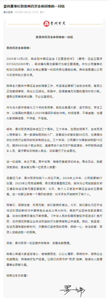 上述公告发布两小时后,贵州百灵官方微信公众号发布了题为《姜伟董事长致贵州百灵全体同事的一封信》的推文。