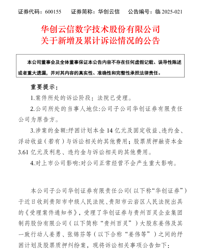 今年8月15日,华创云信数字技术股份有限公司(以下简称“华创云信”)发布公告称,其子公司华创证券起诉贵州百灵大股东姜伟及其一致行动人的纾困计划履约纠纷、股票质押融资纠纷两案,已收到当地法院的案件受理通知。两案涉案金额合计高达17.61亿元,涵盖纾困计划本金14亿元、股票质押融资本金3.61亿元,以及相应固定收益、违约金等相关费用。
