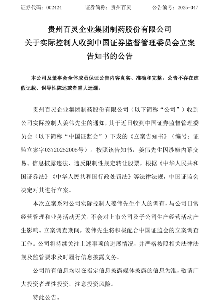 公告中,贵州百灵表示,此次立案仅针对实控人姜伟个人,与公司日常经营管理及业务活动无关,不会对上市公司及子公司的生产经营产生影响。立案调查期间,姜伟将积极配合证监会的调查工作。公司将持续关注事项进展,并严格依照相关法律法规及监管要求,及时履行信息披露义务。