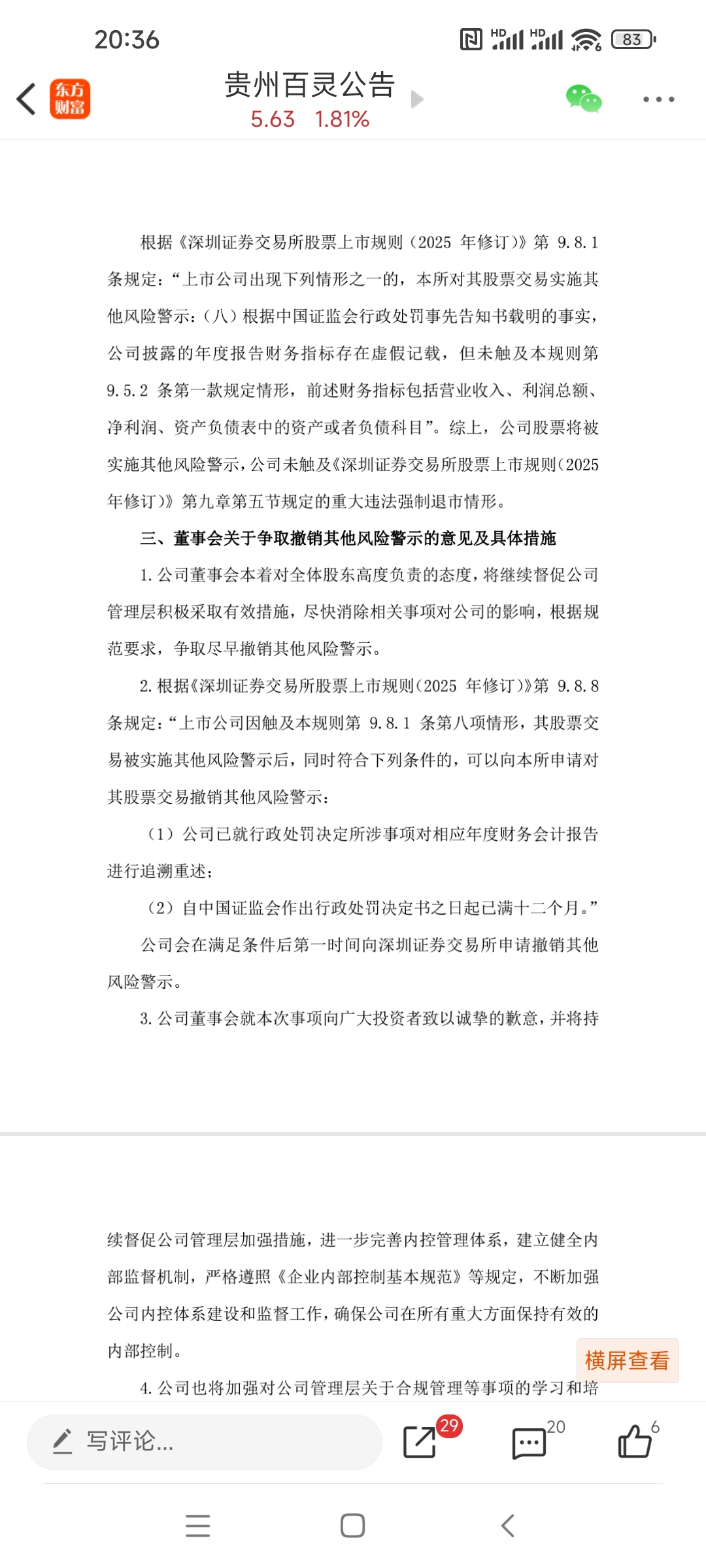 $贵州百灵(SZ002424)$ 未触及重大违法强制退市情形,一年后可申请摘帽。